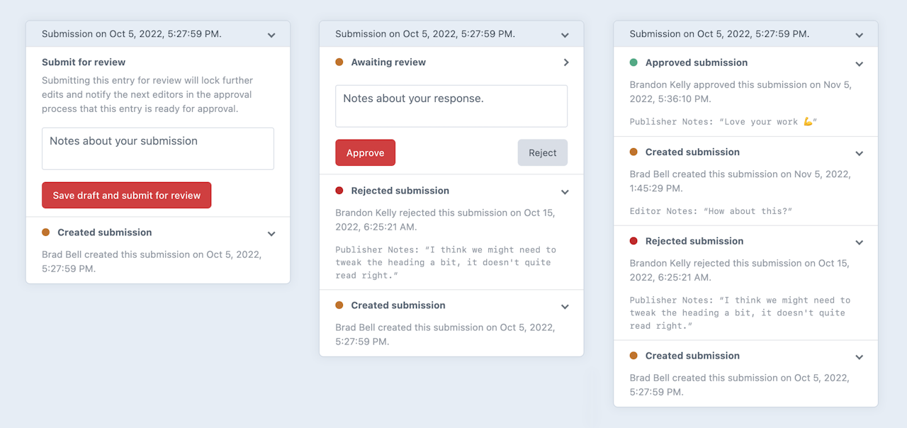 Now, in Workflow 2, a single submission is created by an editor, and used for the duration of the review process. The only way a submission can be completed (so an editor can start another submission process) is for the Editor to revoke the submission, or a Publisher approving it. Rejections and Reviewer approvals will not complete a submission.