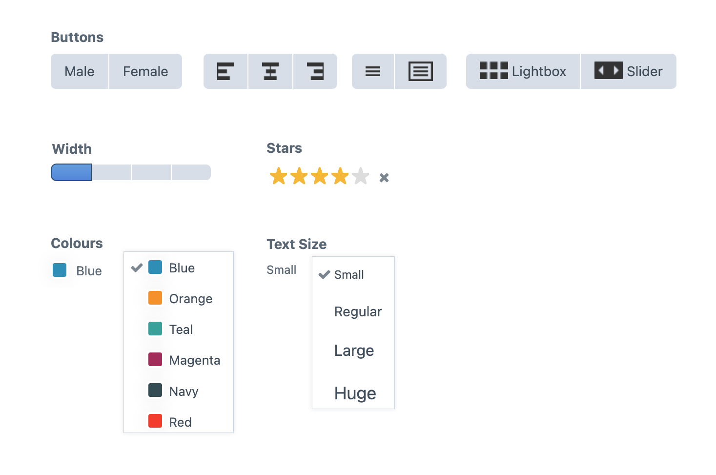 A treasure trove of useful buttons including colours, text size, width, stars, ratings and more.