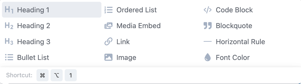 value, if your node supports keyboard shortcuts. For the shortcut value, you can provide the keyboard shortcut exactly as you'd use it in your extension (e.g. Mod-Alt-c